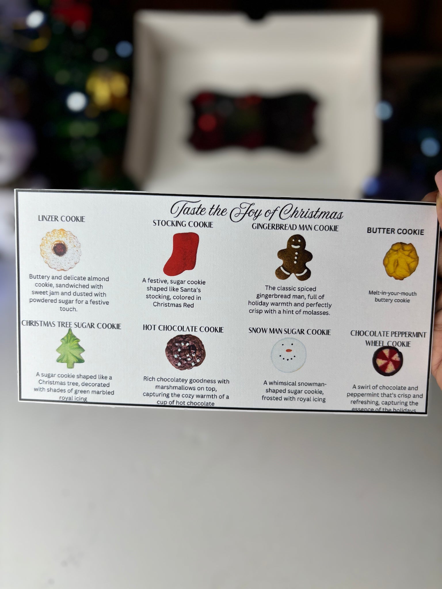 Gingerbread man cookiesChristmas tree sugar cookiesChocolate peppermint wheel cookiesStocking cookiesHot Chocolate drop cookiesIced Snowman sugar cookies Butter cookiesLinzer cookies