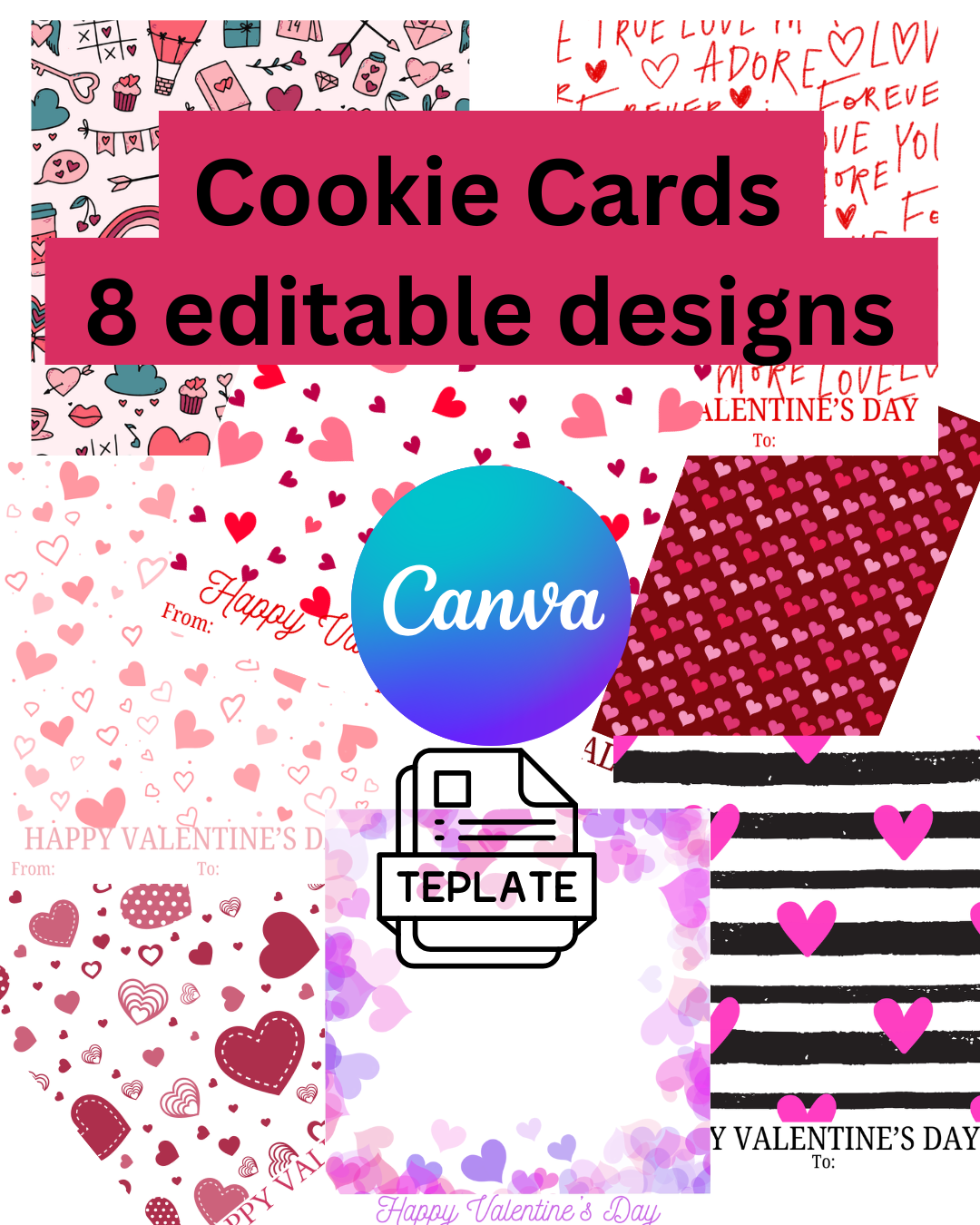 Each template is fully editable, allowing you to personalize names, messages, colors, and fonts to match your brand or occasion. Whether you’re selling cookies, gifting homemade treats, or packaging Valentine’s desserts for customers, these printable cookie cards add a polished, professional touch.